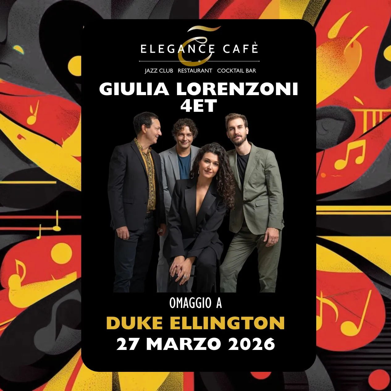 Venerdì 27 marzo 2026 l’Elegance Cafè Jazz Club ospita un nuovo appuntamento di concerti jazz Roma 27 marzo 2026: un omaggio a Duke Ellington interpretato dalla Giulia Lorenzoni 4et.